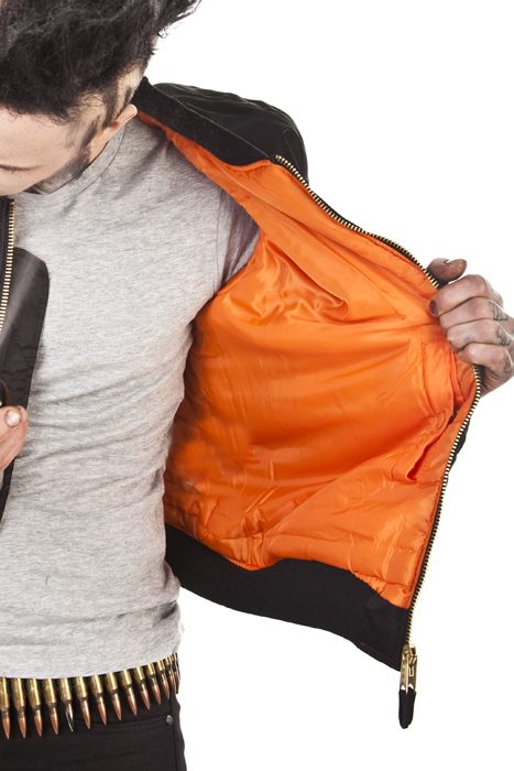 Bomber Jacket Green on Banned Apparel -merkin kimaltelevan vihreä bombertakki, jossa on oranssi vuori. Takki on unisex-tyylinen ja siinä on kaksi ulkotaskua, yksi käsitasku ja kaksi sisätaskua.