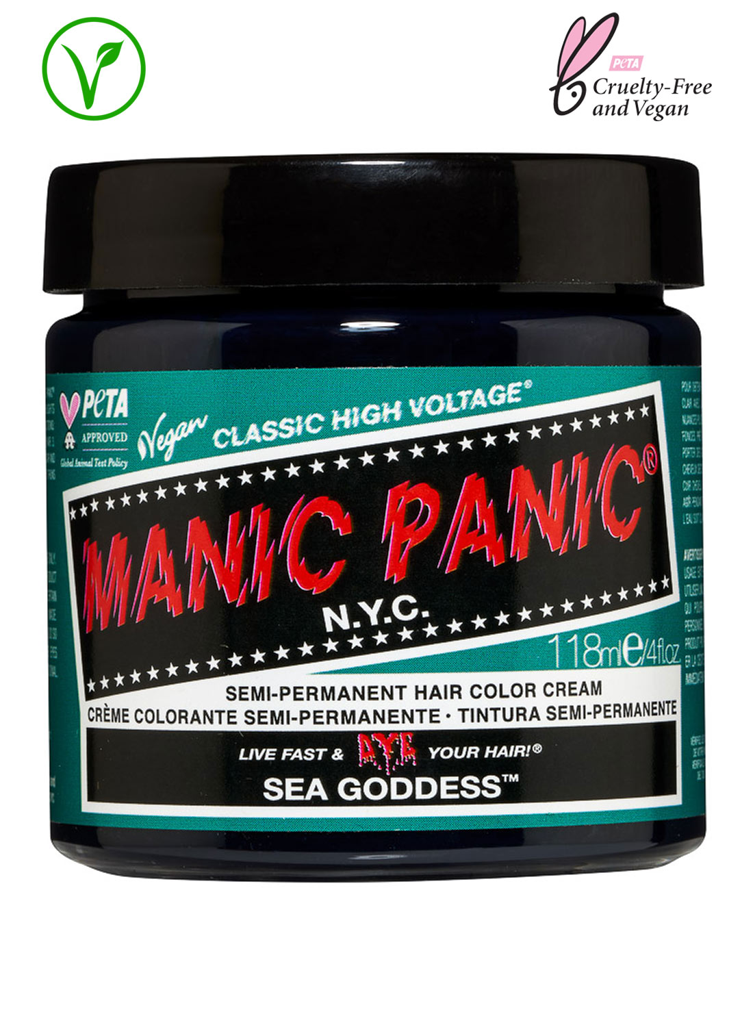 Manic Panicin Classic Sea Goodess on puolikestoinen hiusväri, joka antaa hiuksille vihreän sävyn.
