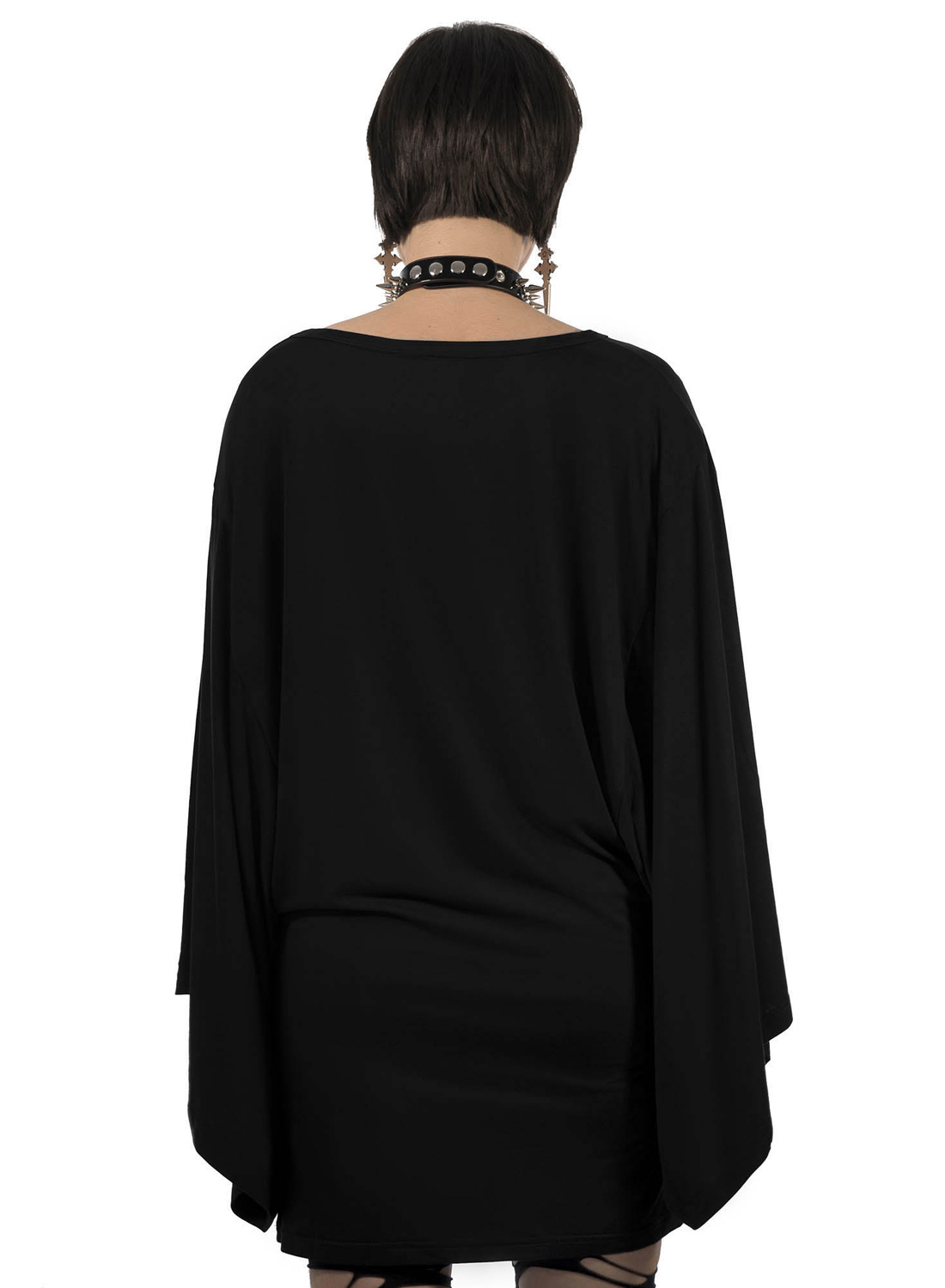 Pitkä ja pehmeä joustava trikoo, jossa pitkät ja leveät hihat, leveä pääntie ja painatus edessä.