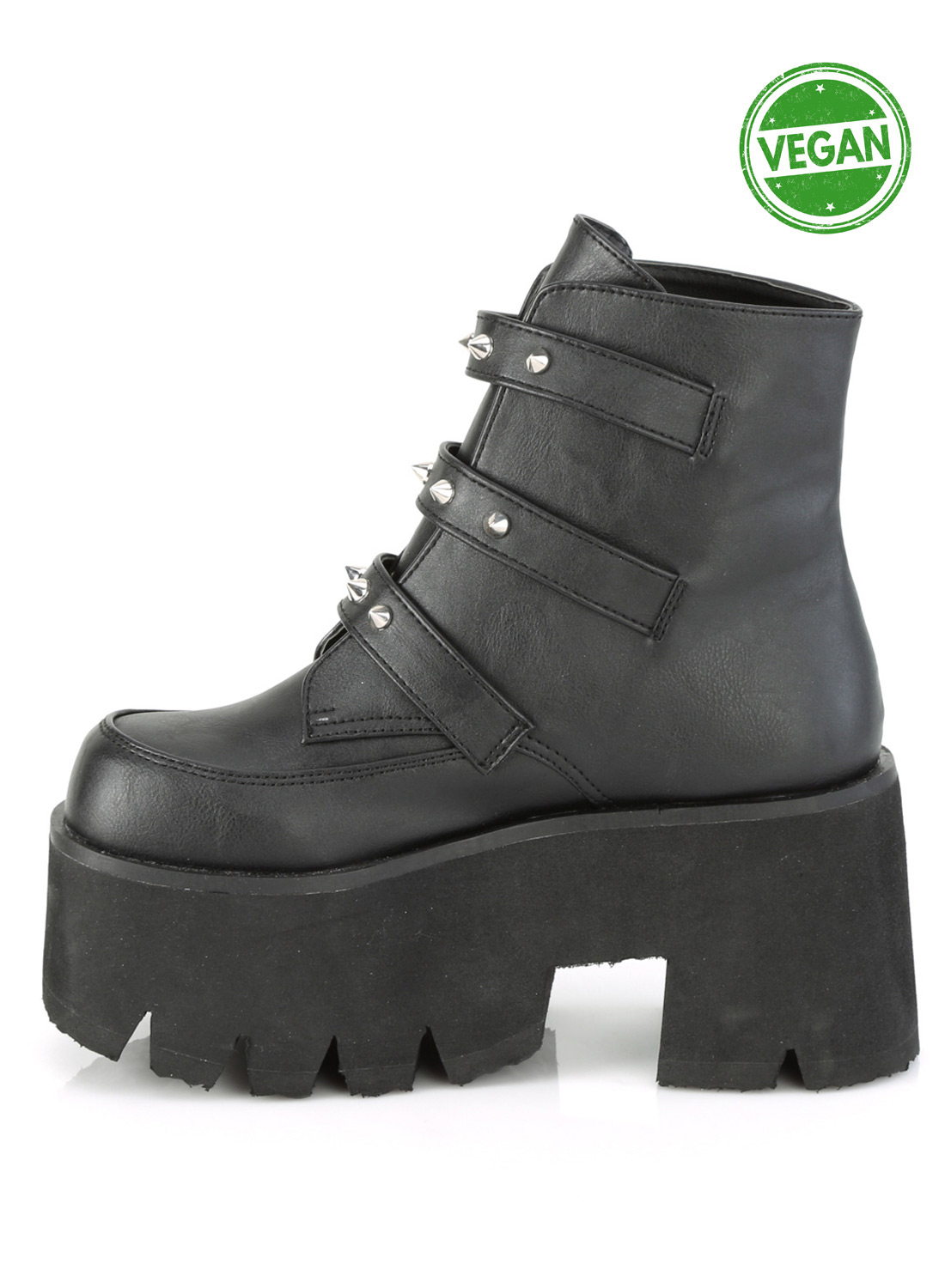 Demonia Ashes-55 Black ovat Demonian vegaanikengät/saappaat. 5,7 cm alusta ja 9 cm kantapää. Leikkaa alustasaappaat 3 nastallisella soljella.
