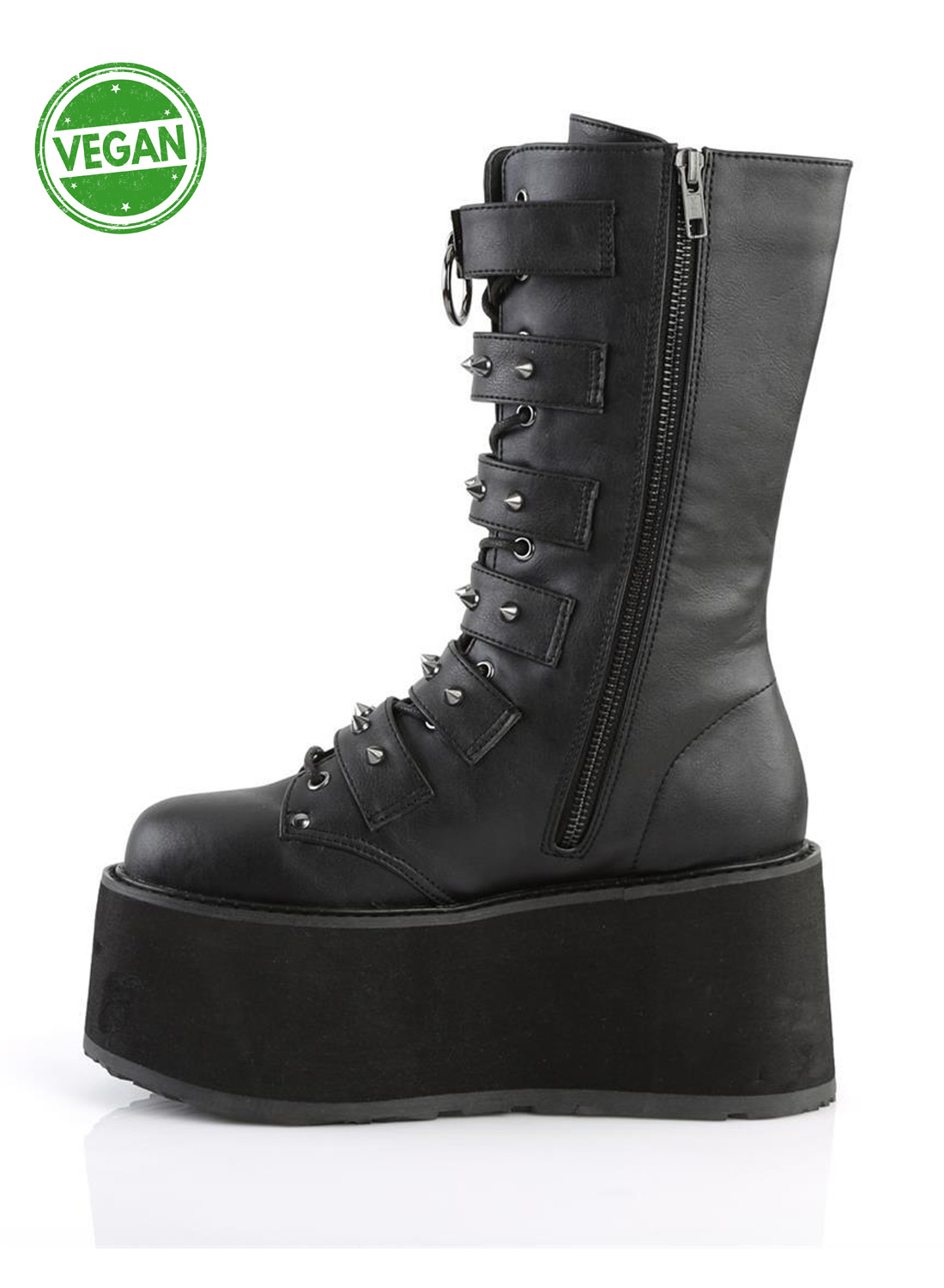 Demonia Damned-225 on todella mukava vegaaninen boot, 9 cm><, gootti, punk, gogo.Ssaappaat, joissa nauha edessä ja 6 solkihihnaa niiteillä, metallivetoketju sisällä