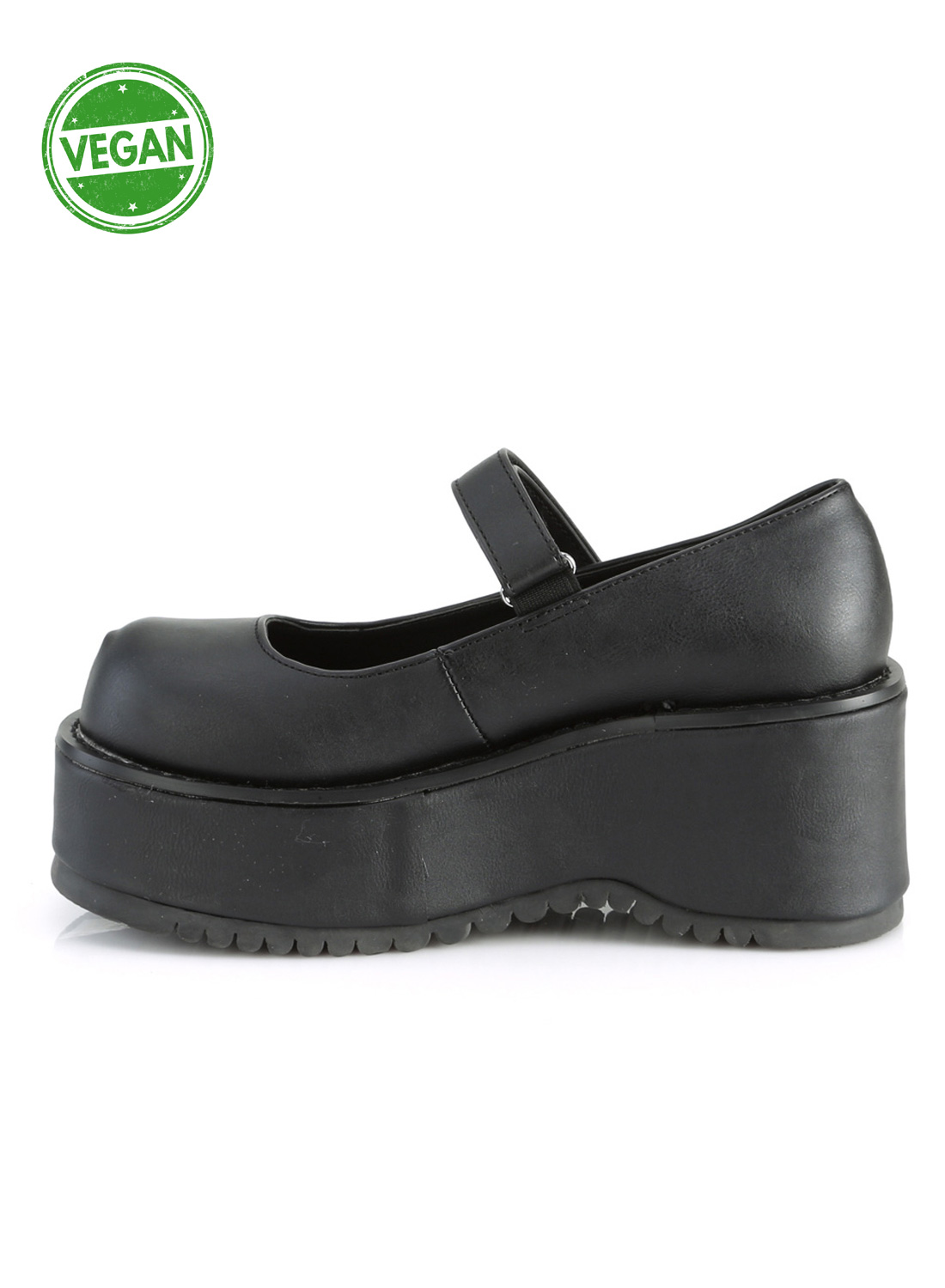 Demonia Dollie-01 Black on vegaaninen Mary Jane -kenkä Demonialta. 8,3 cm korotettu pohja nilkkaremmillä.