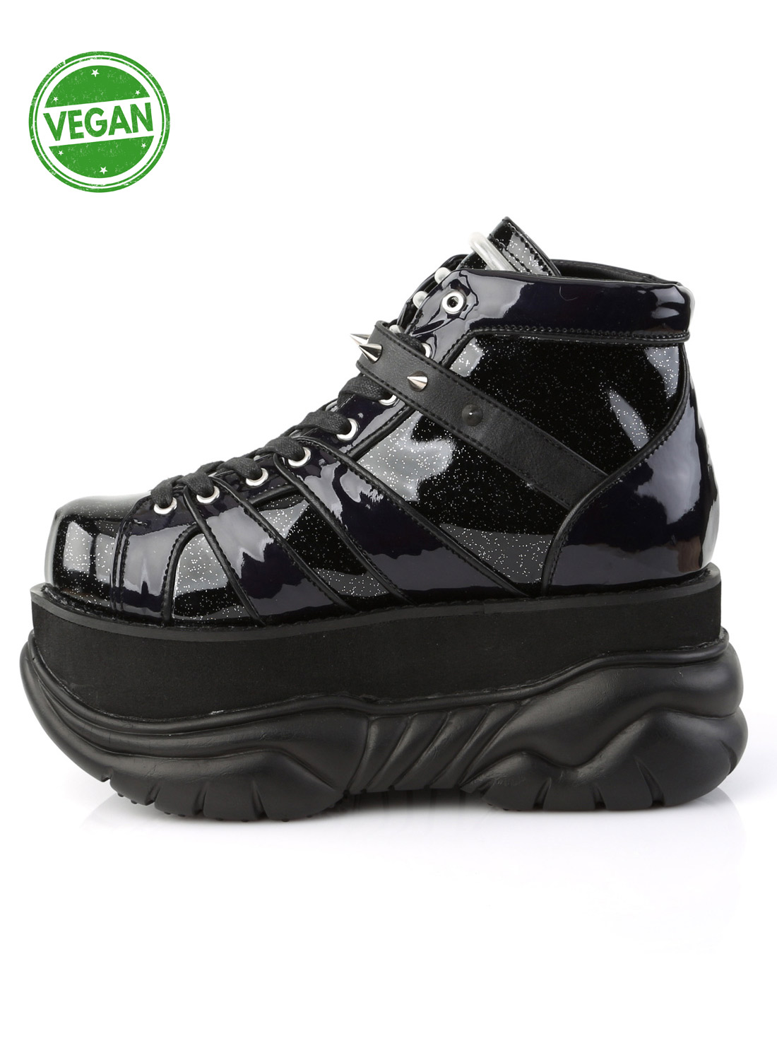 Demonia Neptune-100 on vegaaninen kenkä/saapas Demonialta. 7,6 cm korotettu korokepohja, jossa nauhat edessä, nilkkaremmi niiteillä ja UV-säteille reagoivat remmit kengän päällä.