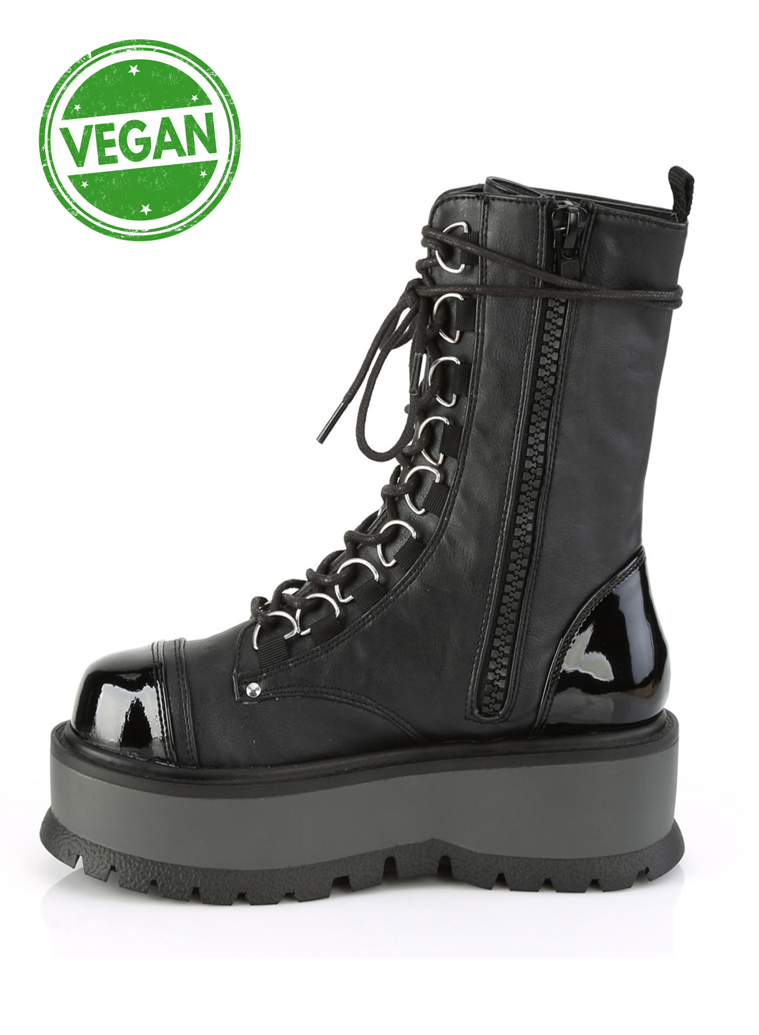 Demonia Slacker-150 ovat Demonian vegaanisaappaat. 5,1 cm alusta. D-rengasnauha edessä keskikorkealla saappaalla, sisäpuolella vetoketju. Sekoitettu matta- ja lakatulla vegaanisella nahalla.