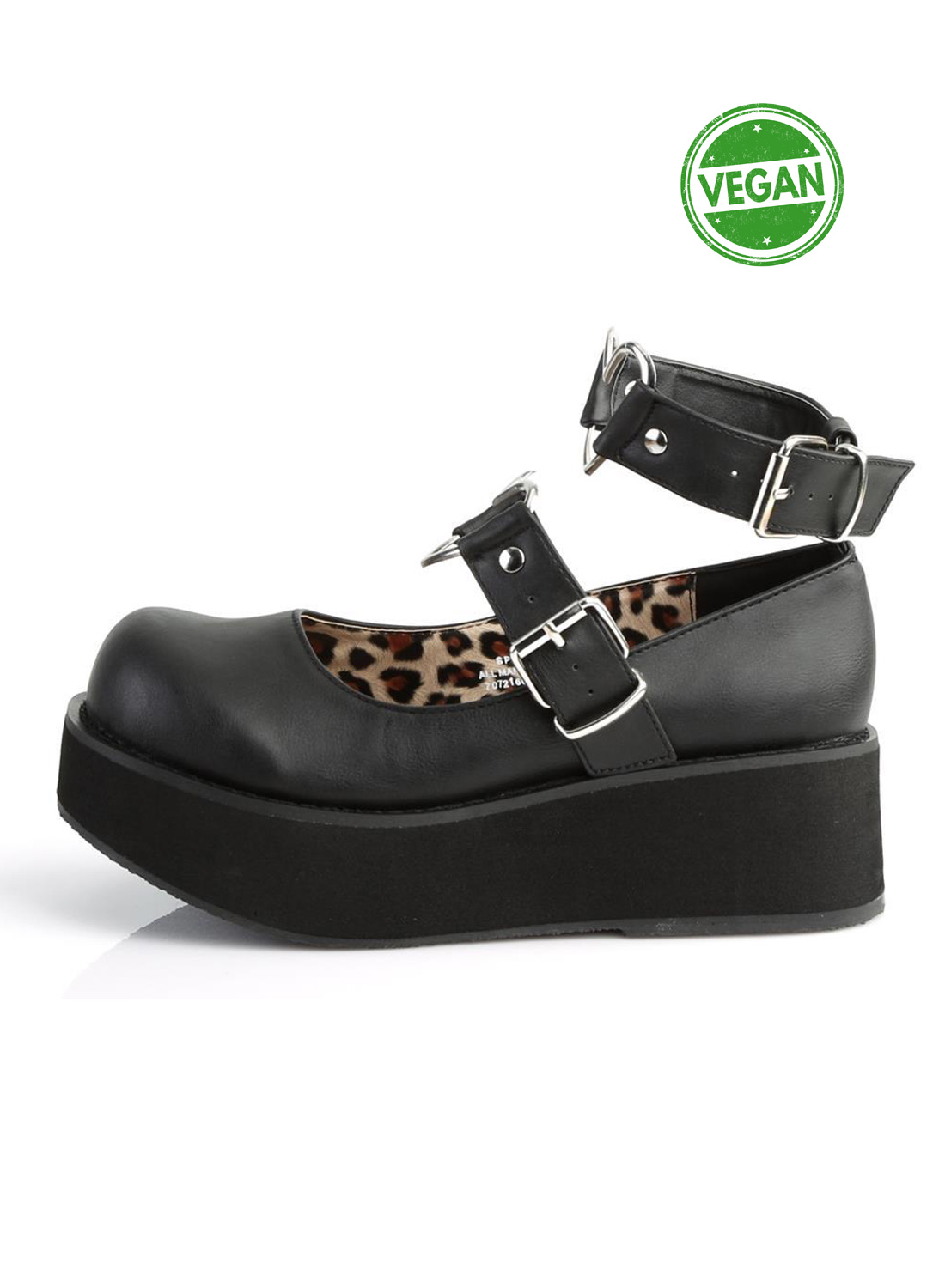 Demonia Sprite -02 Black on vegaaniset Mary Jane -kengät Demonialta. 5,7 cm alusta nilkkahihnalla sydämen O-renkaalla.