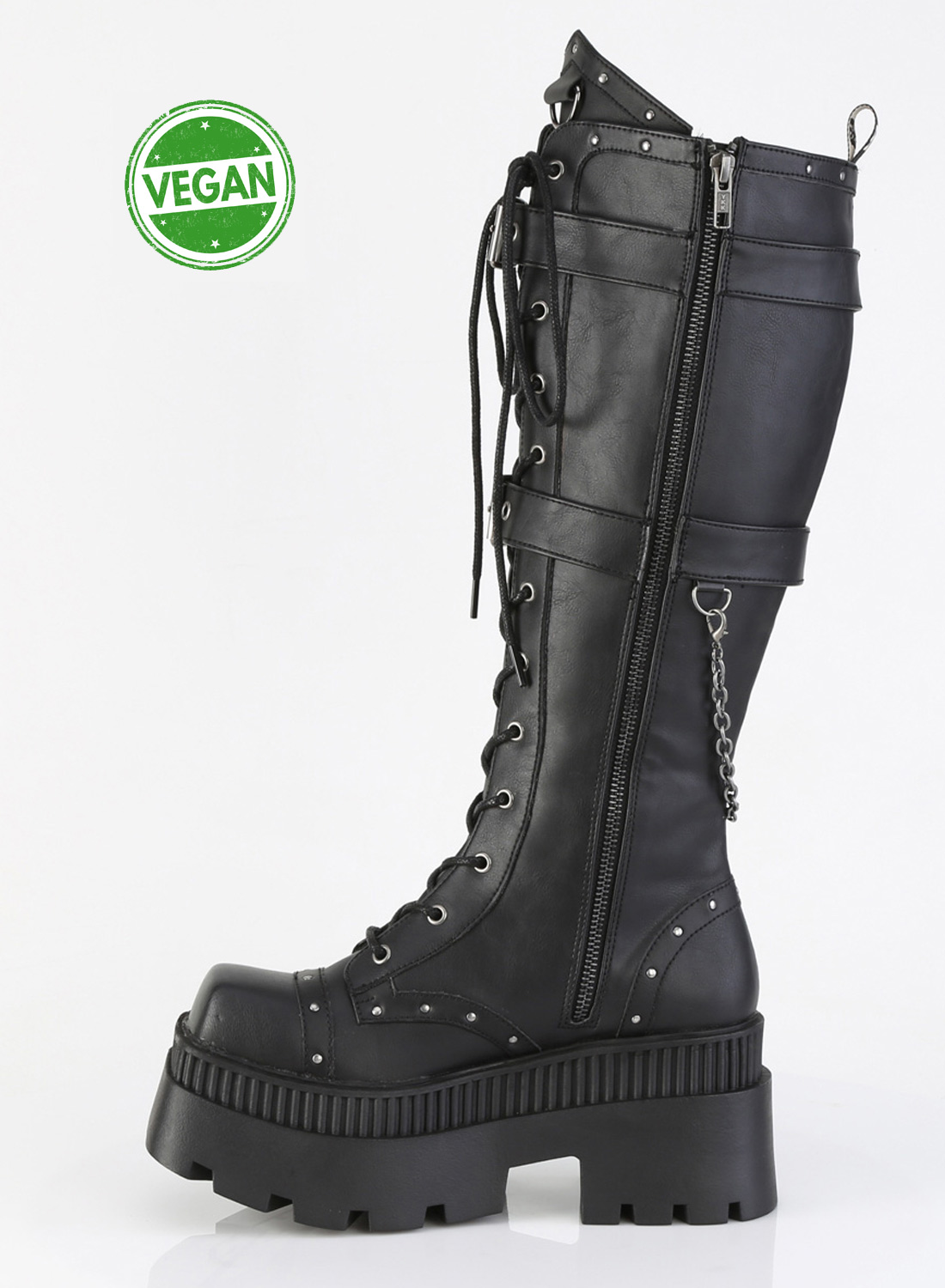 Demonia Wrath-205 ovat Demonian vegaanikengät/saappaat. 5,1 cm alusta ja 8,3 kantapää. nauha edessä, täyspitkä vetoketju. Polvisaappaat, jossa D-rengas sivutasku & kallon käsien koristeet & riippuvat ketjun yksityiskohdat ja niitin yksityiskohdat.