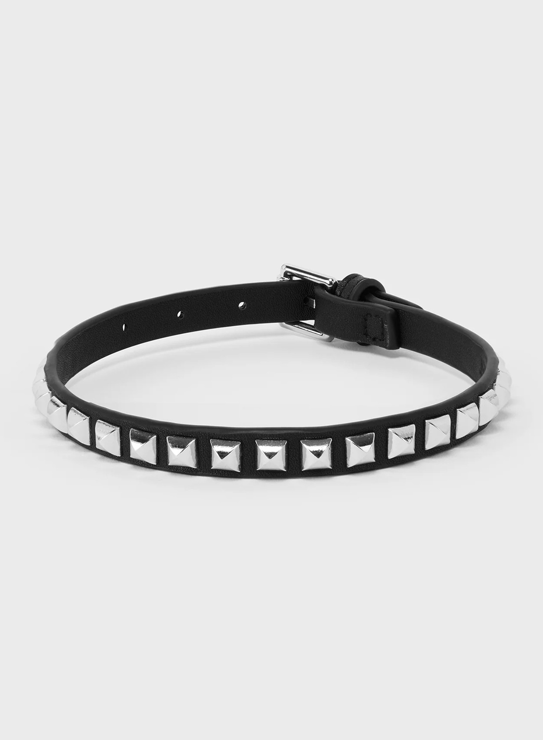 Tumma ulkoasu, korkealaatuinen hihna, PU-materiaalia, paitsi reunanauha, jossa on pyramidimetalliniiteillä säädettävä kiinnitys täydellisen istuvuuden takaamiseksi.