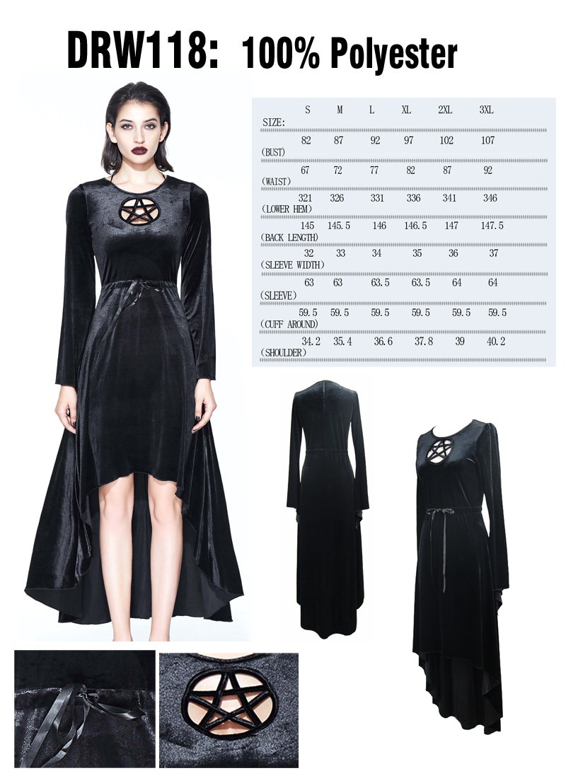 Morticia, Restless ‘N’ Villi. Fantastisen kaunis mekko joustavasta sametista, jossa edessä pentagrammikoriste. Silkkinauha vyötäröllä parantaa istuvuutta.