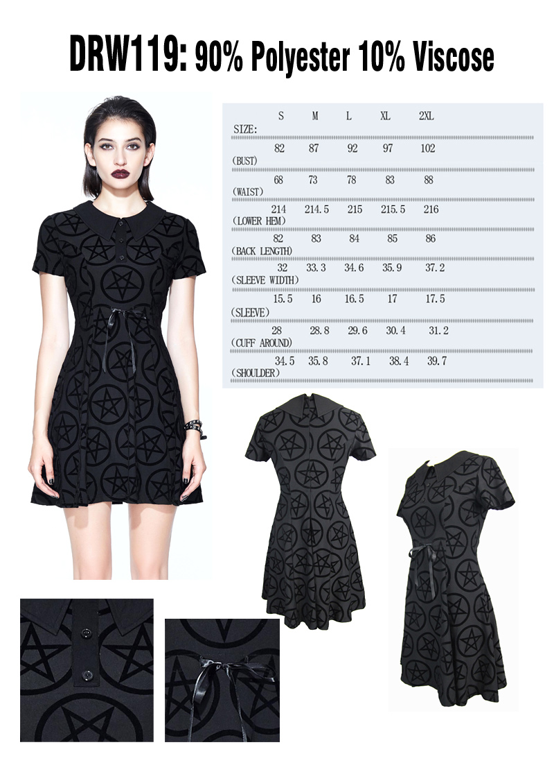 Pentagram Vampirela mekko Restless ‘N’ Villi. Hämmästyttävän kaunis mekko pehmeästä joustavasta trikoosta, jossa musta kaulus ja tässä edessä koristeellinen nappits. takaisin. Silkkinauha vyötäröllä parantaa istuvuutta.