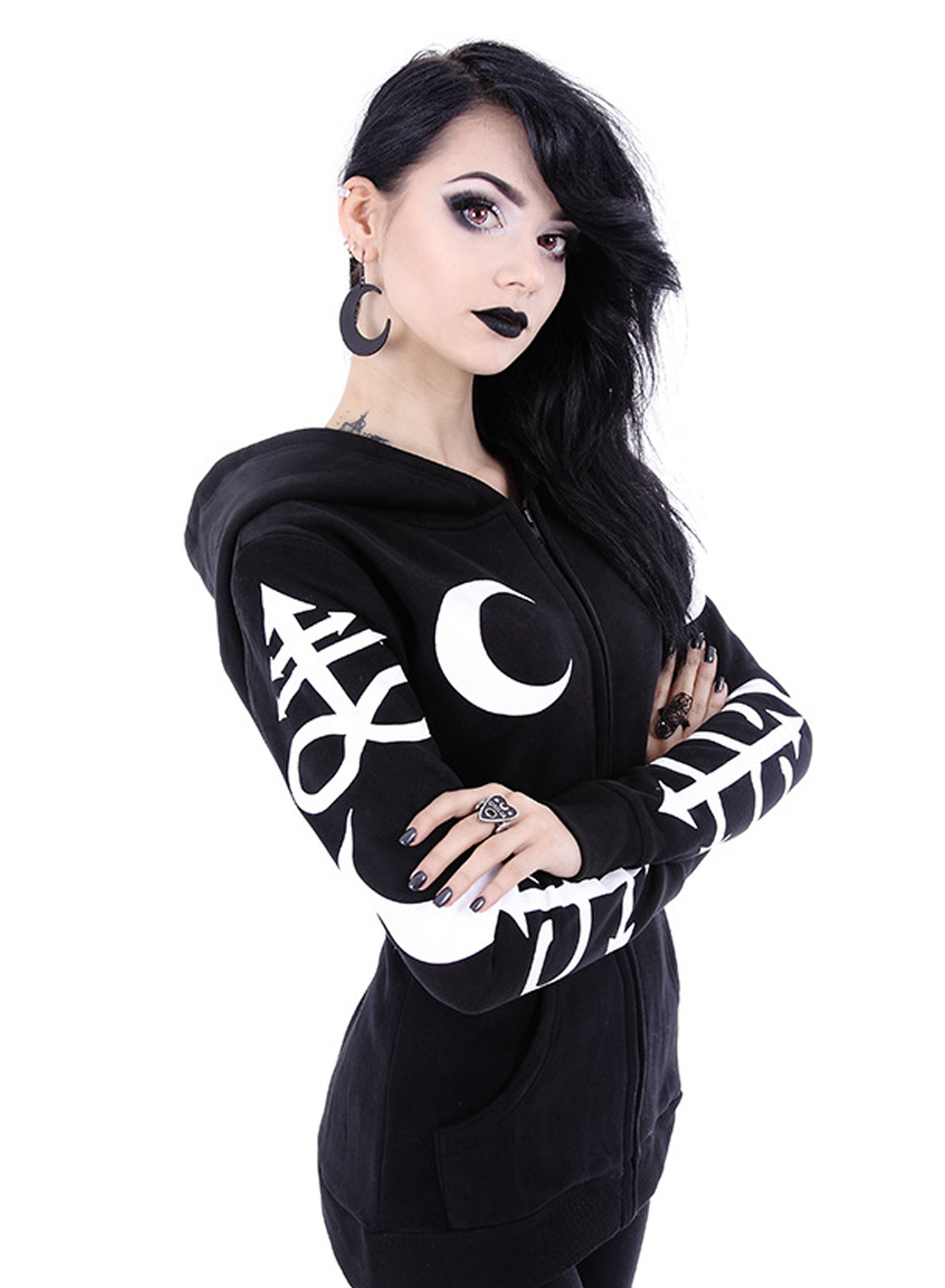 Restyle Occult Symbols Hoodie on Restylen tyylikäs, goottilainen, istuva huppari. Ylisuuri huppu, jonka reunassa on WITCHCRAFT-painatus. Hihat on peitetty suurilla alkemiallisilla symboleilla. Siinä on vetoketju ja kaksi taskua, jotka lisäävät välitöntä draamaa päivittäisiin rituaaleihisi. Tämän hienompaa hupparia et löydä!