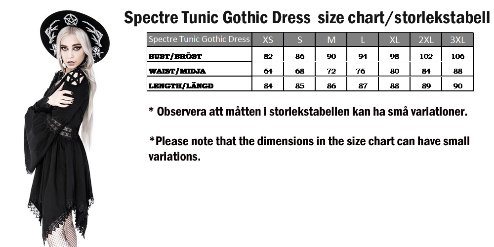 Tunika tarjoaa monia asuvaihtoehtoja. Voit käyttää sitä yksinään mekkona sukkahousujen tai verkkosukkien kanssa. Se sopii hyvin myös leggingsien kanssa käytettäväksi tunikaksi valikoimastamme. Oikeilla lisävarusteilla saat klassisen goottilaisen, romanttisen fantasia tai jopa pakanallisen noidan vaikutelman!