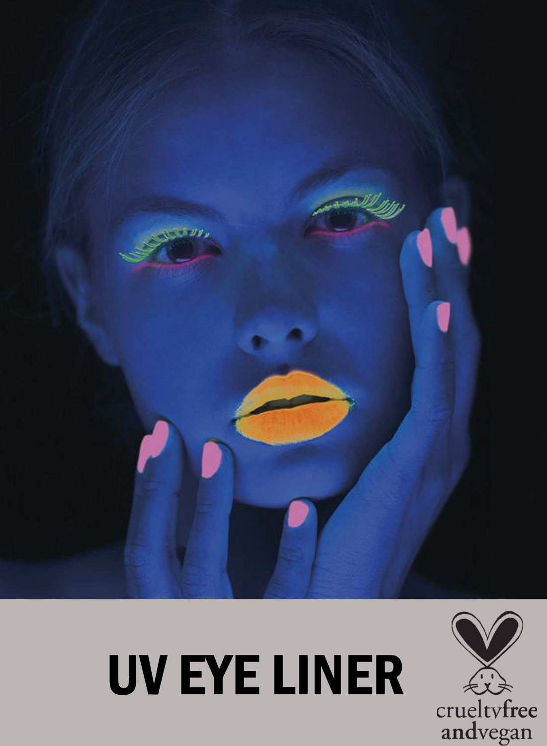 Erittäin pigmenttinen nestemäinen Neon eyeliner -seos tarjoaa rohkean silmän ilmeen, joka on tahraton ja tahraton ilman tahroja tai ylimääräistä väriä. Neonpigmentit reagoivat ja hehkuvat UV-valossa ja fluoresoivat kirkkaasti. Neonvalo on hyvin erottuva ja erottuu joukosta klubilla tai festivaaleilla. Käytä eyelineria intensiiviseen kehystykseen, ohut sivellin antaa tasaiset viivat kestävän intensiivisyyden takaamiseksi.