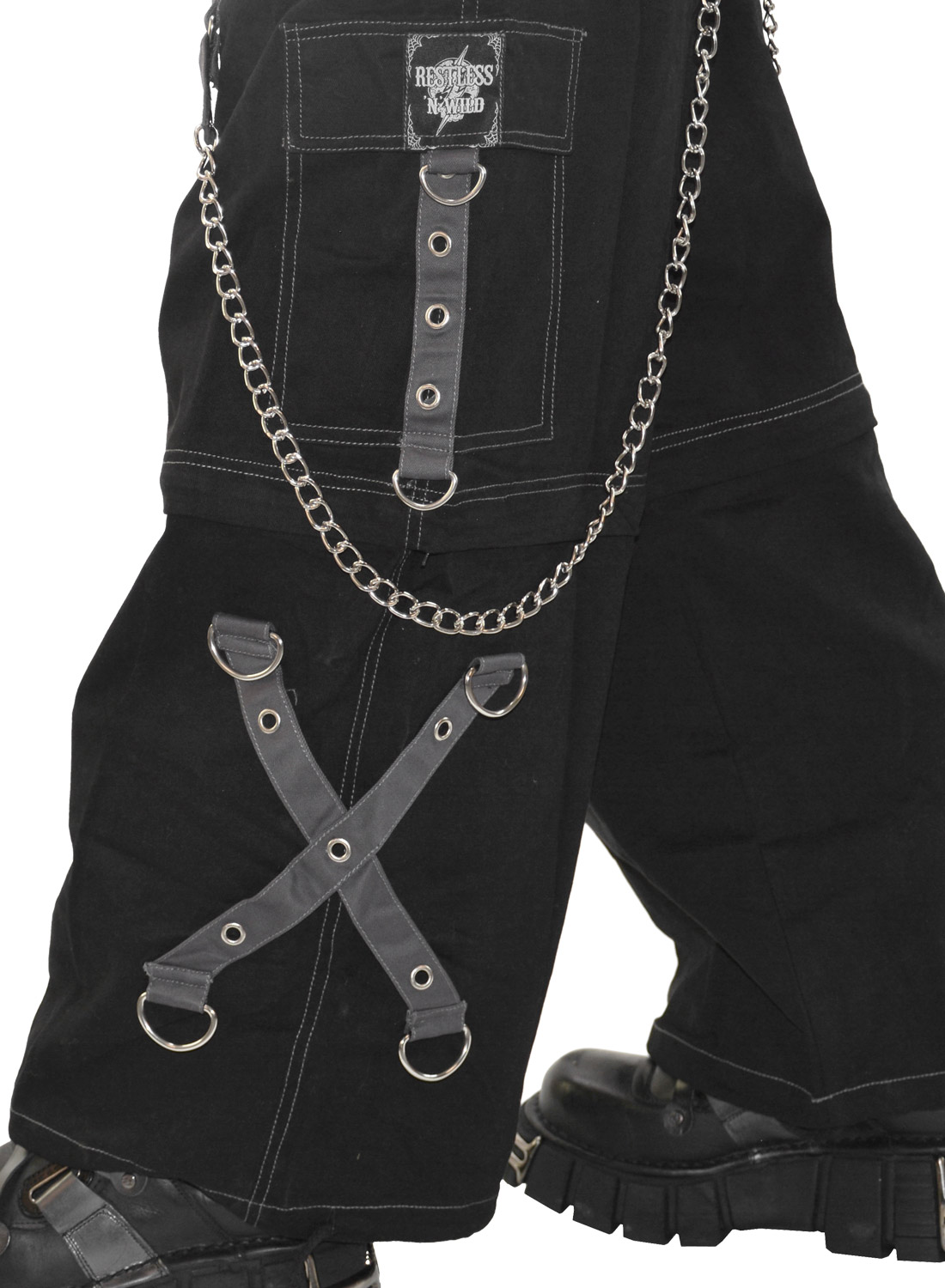 Munilla taskuilla, niiteillä ja irrotettavilla ketjuilla ja nauhoilla. Housujen lahkeissa on vetoketju, jotta housut voidaan muuttaa shortseiksi.