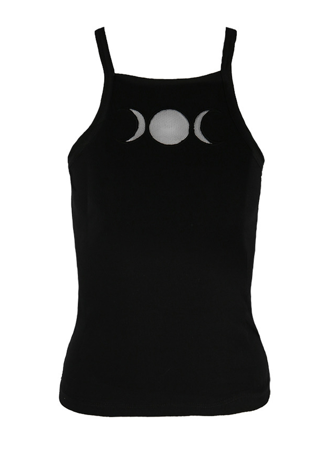 Tripel Goddess Black Top on tyylikäs, okkulttinen Restylen toppi. Tiukka malli avoimilla hartioilla – rintakuvan poikki leikattu kolmoiskuu on läpinäkyvää verkkokangasta.